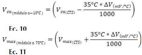 Para conocer la tensión del circuito abierto del módulo a temperatura de -10°C y la tensión máxima del módulo a la temperatura de 70°C se utilizaron las ecuaciones 10 y 11.