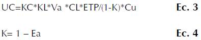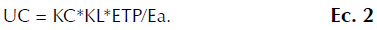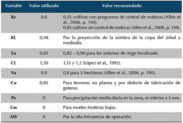 De acuerdo con la FAO (Allen et al., 2006, p. 190), se debe realizar una corrección del UC, por advección (Va), que depende del tamaño del área por regar; por uniformidad (Cu), porque los terrenos no son totalmente planos; y, adicionalmente, hay defectos de fabricación en algunos de los orificios utilizados como goteros. Por último, fueron tenidas en cuenta las pérdidas por percolación (K). Estas correcciones se debieron tener en cuenta para las ecuaciones 3 y 4.
