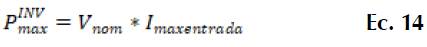 Para el cálculo de la potencia máxima de corriente directa (DC) del inversor, se utiliza el voltaje nominal del inversor y su corriente máxima. Estos datos son obtenidos a partir de las características técnicas. El cálculo se obtuvo con la ecuación 14.