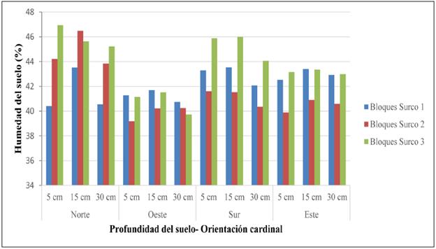 Se promediaron las siete frecuencias de toma de lecturas, las cuales partieron del 5 de noviembre de 2019 hasta el 6 de marzo de 2020. Estas lecturas se sumaron y promediaron por cada punto cardinal a un solo dato de lectura por punto cardinal por árbol por surco, para las tres profundidades de registro de humedad en el suelo.