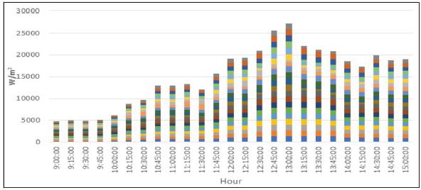 Las variables medidas del sistema fotovoltaico para el bombeo hidráulico del riego en el cultivo de limón -realizadas en el horario de 9 am a 3 pm, a intervalos de tiempo de 15 minutos- permitieron confirmar que la radiación solar registrada cada 15 minutos tiene un comportamiento homogéneo para todos los días de la semana, con valores mínimos promedio de 240 W/m2 sobre las 9 y las 10 am. Entre las 10 y las 11 am, la radiación solar varía en el intervalo de 350 a 600 W/m2, alcanzando un valor promedio de 900 W/m2 sobre el medio día. En la hora y media siguiente registró valores superiores a 1000 W/m2, y terminó con valores promedios de 850 W/m2 hacia las 15 horas (Figura 3).
