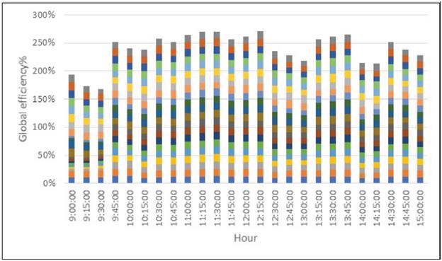 La eficiencia global del sistema tiene un comportamiento constante para los diferentes intervalos de tiempo, con valores mínimos del 8 % durante las primeras horas de la mañana y luego casi constante promediando los 13,5 % durante el resto del día (Figura 4). Por lo anterior se puede deducir que los paneles solares se encontraban trabajando a su máxima eficiencia durante la mayor parte del día, y que las pérdidas de eficiencia a través del sistema de conexión de los paneles y el inversor es muy baja. Adicional a lo anterior se logró ratificar que el sistema no es afectado por el factor de sombra o ensuciamiento de los paneles. La relación de potencia producida y potencia instalada varió entre un 0,1 kW/kWp, en las primeras horas de la mañana, y un 0,84 kW/kWp, al mediodía, con valores máximos de 0,97 kW/kWp durante algunos días. Eso ratifica que el sistema trabajó al 97 % de su capacidad como máximo.