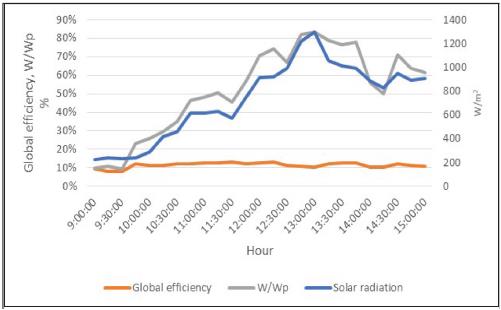 Al comparar la eficiencia global, la relación de energía producida sobre la energía instalada y la radiación solar (Figura 5), se logró apreciar que la eficiencia global del sistema se mantiene en un valor promedio constante de 13,5 %. La radiación solar y la relación de la energía producida sobre la energía instalada siguen una misma trayectoria, que es menor al comienzo de la jornada (sobre las 9:00 horas), aumenta al mediodía y disminuye en horas de la tarde. Para valores mínimos de radiación solar 240 W/m2, la relación se mantiene sobre 0,1 W/Wp, alcanzando valores máximos de 0,84 W/Wp para valores de radiación solar de 1200 W/m2. Por lo anterior, se puede afirmar que el sistema respondió de forma adecuada, con un comportamiento normal para sistemas de este tipo, aumentando su capacidad de producción para valores mayores de radiación solar y disminuyendo para valores menores.