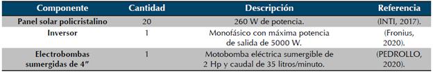Se han realizado varios estudios relevantes sobre instalaciones de sistemas de bombeo de agua fotovoltaica, realizados entre 1981 y 2018 (Carrelo et al., 2020), los cuales mostraron una potencia de entre 0,5 y 3 kWp. Además, hay otras publicaciones que se concentran en el análisis económico de sistemas bombeo de agua fotovoltaica cuya potencia está entre 1 y 8 kWp. Esos estudios indican que la potencia del sistema fotovoltaico para el bombeo hidráulico solar propuesto (de 5,2 kWp) está contenido dentro de los modelos implementados y analizados económicamente para determinar su viabilidad financiera y su uso técnico y tecnológico, en este caso para el sistema de riego de cultivos de limón.
