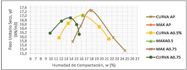 Los valores promedio de peso unitario seco máximo (Ydmáx) y de humedad óptima de compactación (wópt), se encuentran próximos a su media para las cuatro repeticiones necesarias. El parámetro de peso unitario seco máximo (Ydmáx) decrece en 1.09 %, para los diferentes tratamientos, con una diferencia de alrededor de 0.40 kN/m3. De igual manera, el parámetro de humedad óptima de compactación (wópt) disminuye 12.4 % con respecto a la muestra sin tratamiento, teniendo una variabilidad porcentual baja para ambos parámetros.