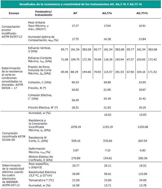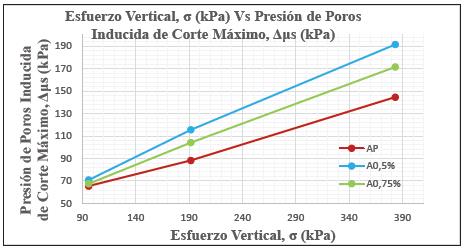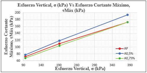 Los valores obtenidos del ensayo a la resistencia al corte no drenados, se encuentran próximos a su media para las cuatro repeticiones. La cohesión y fricción en diferentes condiciones mostraron una variabilidad porcentual baja con respecto al valor de la arcilla patrón, Ap; el esfuerzo cortante máximo (Tmáx) varía entre 6.7 % y 6.9 % para tres cargas verticales (σn) de 95.8 kPa, 191.5 kPa y 397.2 kPa, respectivamente. Los valores obtenidos demuestran que la muestra A0.5 % tuvo el mayor esfuerzo cortante máximo (Tmáx) para las tres diferentes cargas verticales; la muestra A0.50 % supera a la muestra Ap y a A0.75 %, en 21.5 kPa, ya que estas últimas tienen un esfuerzo cortante máximo (Tmáx) similar.