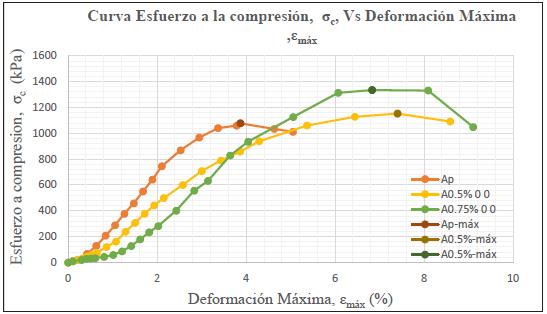 La deformación máxima (εmáx) varía moderadamente, presentando mayores valores para la muestra A0.5 %, la cual supera a la muestra Ap en 3.43 %, deformándose aproximadamente el doble de la muestra patrón antes de llegar a la falla. La muestra A0.75 % supera a la muestra Ap en 2.96 %, sin embargo, al momento de la falla, la muestra perdió su estructura, aun presentando mayores valores de resistencia a la compresión simple (qu) y resistencia al corte (Cu). Los valores obtenidos son lineales, concentrados y homogéneos, en cada una de las repeticiones, con diferencia significativa entre los resultados. Se observa que no hay una distribución normal entre tratamientos, debido a la orientación de fibra entre un rango que no compromete la condición de la matriz. El nivel de compactación, las dimensiones de la probeta y la humedad alteran el valor de deformación máxima (εmáx), pero el porcentaje, orientación y la longitud de las fibras son los factores principales que interfieren en este parámetro.