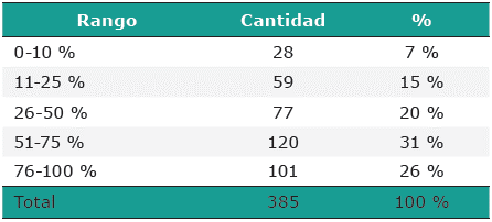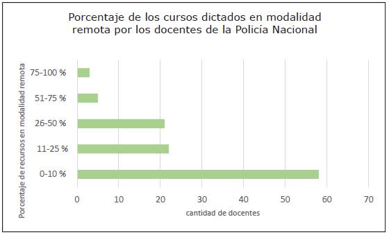 Al indagar por el uso de nuevas tecnologías al desarrollar las diferentes actividades docentes (ver Figura 1), se encontró que un 32 % han implementado las tecnologías durante 1 a 3 años, solamente 3 de los 109 participantes reportan no haber utilizado medios tecnológicos, lo que nos da a entender que, en su mayoría, en algún momento hacen uso de estos recursos. Respecto al porcentaje de los cursos dictados en modalidad remota por los docentes de la Policía Nacional, el caso más frecuente es que pocos la hayan empleado en sus cursos, 58 % de profesores reportan entre 0 a 10 % de uso dentro de las modalidades implementadas (ver Figura 2).