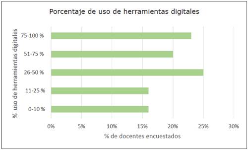 A pesar de esto, se observa que el personal docente encuestado hizo uso de herramientas digitales para el desarrollo de sus clases, como se evidencia en la Figura 2, dado que el 78 % de ellos indicaron que en los últimos 2 meses el 25 % de sus actividades se desarrollaron a través de TIC.