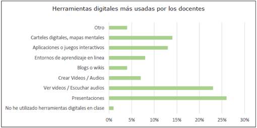 La Figura 3 presenta los datos obtenidos sobre el porcentaje de herramientas digitales usadas por el personal académico. Los datos revelan que las herramientas más frecuentes son las presentaciones, audios y videos, como también aplicaciones y mapas mentales, los cuales motivan al estudiante a explorar medios digitales.