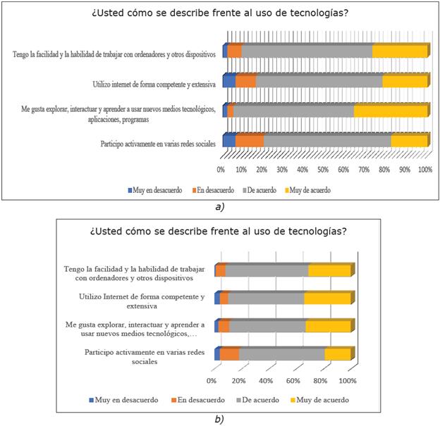 Asimismo, en la figura 4 se aprecia una comparación entre el dominio de las tecnologías digitales que reportan estudiantes y docentes. Los resultados muestran un dominio muy similar, con mayor cantidad de estudiantes indicando que les gusta explorar, interactuar y aprender el uso de nuevos medios tecnológicos. Esto evidencia que las competencias tecnológicas son similares en ambos grupos y que esto se debe a criterios de edad asociados con la cohorte generacional.