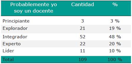 En la Tabla 1 se presentan los datos relacionados con las competencias digitales de las personas encuestadas. Se observa que un 48 % de docentes se autoevalúa en el nivel integrador, 20 % experto y 10 % en la categoría de líder. Este resultado es congruente con lo reportado respecto al uso de las herramientas digitales en la actividad docente.