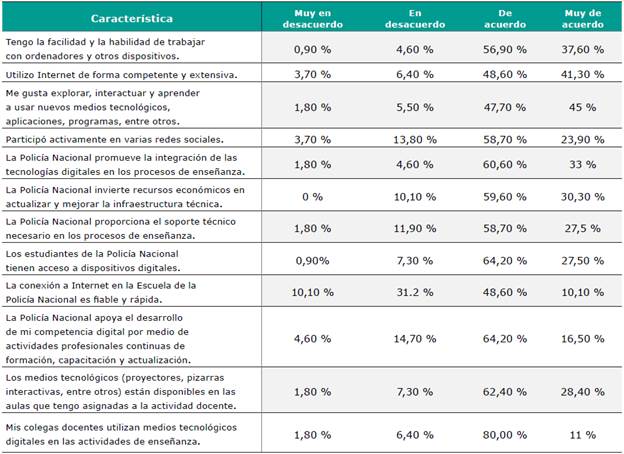 En la educación virtual como modalidad educativa, es evidente la importancia de las competencias digitales de los docentes, ya que permiten enseñar a sus estudiantes a seleccionar, gestionar y emplear las herramientas digitales de forma correcta. En el caso de la formación policial, un docente competente puede emplear de forma asertiva las herramientas digitales que motivan el proceso de enseñanza aprendizaje, que para el caso colombiano están definidas en las competencias institucionales y en el marco de las competencias definidas por el Ministerio de Educación Nacional. Este último define tres niveles de competencia TIC; el nivel de exploración, se define como una primera aproximación a un mundo desconocido; el segundo nivel, denominado nivel de integración, se define como el desarrollo de capacidades para usar las TIC de forma autónoma; finalmente, el nivel tres o nivel de innovación, es aquel en el cual el usuario pone nuevas ideas en práctica, usa las TIC para crear y expresar sus ideas, así como para construir nuevos conocimientos.