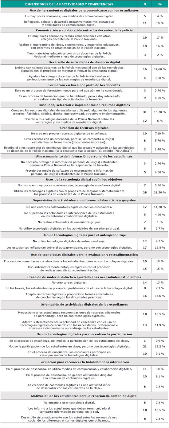 Respecto a las dimensiones de competencia reportadas por los docentes, la Tabla 3 muestra la cantidad de docentes y porcentajes respectivos que dieron una respuesta positiva a cada uno de los ítems.
