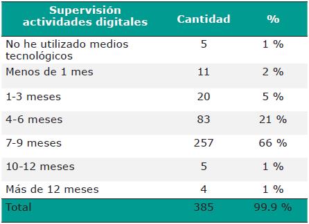 En relación con los aspectos didácticos propiamente dichos, se encuentra que al menos el 30 % del personal académico empleó herramientas digitales para sus propósitos pedagógicos (las presentaciones en Power Point y los televisores inteligentes son los recursos más ampliamente usados), y que un 25 % y el 23 % del cuerpo docente han realizado procesos más complejos que implican una adopción de las tecnologías más complejo y con mejores usabilidades, solo el 6,4 % han empleado objetos virtuales de aprendizaje. De forma complementaria, se indagó por la creación de tareas digitales y se encontró que la mayoría de profesores emplean esta estrategia en su enseñanza, solo un 13 % reporta lo contrario. Un 45,7 % ha llegado a las competencias más complejas como son el adaptar las tareas digitales con la finalidad de minimizar las dificultades técnicas y proporcionar formas alternativas de concluirlas según las dificultades prácticas.