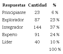 Finalmente, con el propósito de contrastar los hallazgos en el reporte de los docentes, se realizaron encuestas a 385 estudiantes de los grupos en los cuales estos profesores desarrollaron sus clases. Se observa en la Tabla 4 que, al igual que el personal académico, los estudiantes con más frecuencia se autoevalúan con competencias ubicadas en la categoría "Integrador", pero aumenta la cantidad de quienes se consideran expertos y líderes.