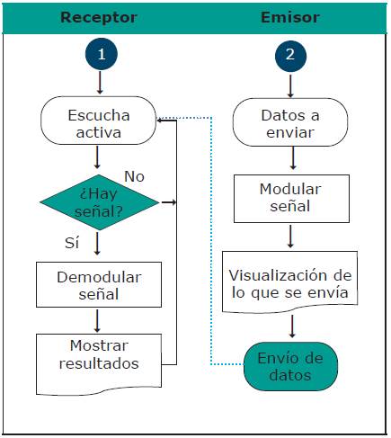 Para la implementación del proceso de transmisión, se definió un flujograma básico de funcionamiento (Figura 6). Lo primero realizado fue fijar el equipo receptor en modo escucha permanente y a una distancia de 1 metro (Figura 3), con ello, a través del micrófono conectado, se realiza la captura de las diferentes ondas ultrasónica emitidas; luego, desde el equipo emisor y con la ayuda del software construido, se envían datos usando el ultrasonido como onda envolvente, lo que genera una modulación ultrasónica que es enviada a través del parlante (Figura 2).