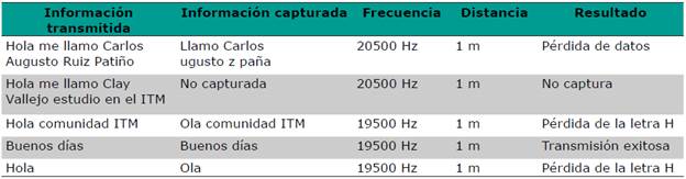 Los resultados obtenidos (Tabla 1) muestran cómo la información transmitida por ultrasonido es capturada, asimismo el registro de la frecuencia, la distancia y el resultado final, para lo cual, se establece una prueba exitosa de paso de datos por ultrasonidos, considerando siempre la misma distancia (1m) y enviando desde frases cortas hasta unas más extensas, con ello, se puede apreciar que cuando la frase es más larga, la pérdida de datos es mayor, también hubo una variación con respecto a la frecuencia, cuando la frecuenta está casi en el límite del ultrasonido, tiene mejores resultados.