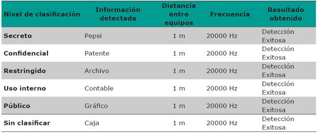 Para la evaluación de la transmisión, se ejecutó una serie de pruebas de envío y recepción de datos, evaluando la efectividad y usabilidad del software, con lo cual, se ejecutó una prueba que simula el robo de información desde una máquina de cómputo a otra, usando un método que modula y de-modula la información que es transmitida por ondas ultrasónicas, tabulando la siguiente información: información transmitida, información capturada, frecuencia, distancia y resultado. Asimismo, se hace una evaluación de la información y cómo esta puede constituirse un delito informático en términos de la ley.