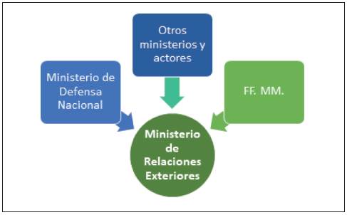 En la figura 1 se muestra una jerarquía en la cual el Ministerio de Relaciones Exteriores se encuentra en una posición central, no por ser más importante que otros ministerios, sino por ser aquel que centraliza y emite la política exterior. En esta jerarquía se denota el insumo que debe dar las FF. MM. al Ministerio de Defensa, y como éste a su vez nutre al Ministerio de Relaciones Exteriores al igual que otros ministerios.
