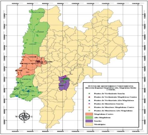 También en esta fase se realizó la caracterización de la jurisdicción mediante el levantamiento de información asociada a vertimientos y compilación de información correspondiente a la caracterización química por municipio, de acuerdo con las estaciones de monitoreo. Para lo anterior, se observó que la corporación realiza el seguimiento al recurso hídrico en diez cuencas hidrográficas correspondientes a los ríos Bogotá, Sumapaz, Seco y otros afluentes directos al Magdalena, Alto Suárez, Medio y Bajo Suárez, Carare, Negro, Guayuriba, Garagoa y Guavio, a través del monitoreo y análisis de parámetros fisicoquímicos y microbiológicos distribuidos en dos campañas realizadas anualmente. Esta información se descargó y se ubicó en mapas que contienen la disposición espacial de los puntos reportados por la CAR para las jurisdicciones. La figura 1 muestra un ejemplo de lo realizado para la dirección Regional de Magdalena Alto, Medio y Soacha (CAR, 2020). Posteriormente, esta información se cruzó con los datos de suelos de la etapa anterior para observar impactos potenciales.