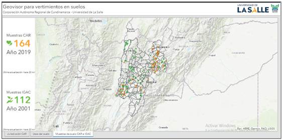 Lo anterior y la figura 3 evidencian una situación compleja que tiene que ver con que los puntos muestreados por ambas entidades son diferentes en ubicación, distribución espacial y variables analizadas. Eso dificulta su comparación y deja evidencia una situación difícil para la Policía Ambiental y Ecológica a la hora de establecer un daño al recurso natural debido a la imposibilidad de comparar con una línea base previa. Pese a lo anterior, se procedió a revisar las variables analizadas de las caracterizaciones del IGAC (en 2001) y de la CAR Cundinamarca (en 2019), que revisten importancia a la hora de evaluar disposición de vertimientos en los suelos, ya que fenómenos como la capacidad de infiltración, retención de agua y disponibilidad y retención de nutrientes en los suelos son afectados y evaluados con algunas de las variables disponibles como textura, granulometría, densidad aparente, pH, CIC, bases intercambiables y carbono orgánico. Para ello, cada variable se analizó de forma independiente para cada zona de la jurisdicción. De esa forma se estableció su incidencia en el vertido y, con esta información, se elaboró un Geovisor (Software que permite visualizar información espacial) donde fueron dispuestos los datos para visualizar en conjunto la problemática de la jurisdicción1.