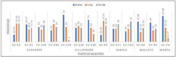 Para el caso de Almeidas, se aprecia en la figura 3 que los municipios de Suesca y Chocontá presentan un porcentaje importante de arcilla y, por ende, buena retención de agua. Por su parte, en los municipios de Villapinzón, Machetá, Manta y -de nuevo- Chocontá se encuentran suelos con un alto contenido de arena o de rápida infiltración.