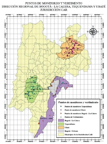 Adicionalmente, en esta etapa se revisaron las caracterizaciones con el levantamiento de información asociada a vertimientos en cuanto a puntos de vertimiento y puntos de monitoreo. En este sentido, la CAR Cundinamarca realiza el seguimiento al recurso hídrico en su jurisdicción sobre diez cuencas hidrográficas correspondientes a los ríos Bogotá, Sumapaz, Seco y otros afluentes directos al Magdalena, Alto Suárez, Medio y Bajo Suárez, Carare, Negro, Guayuriba, Garagoa y Guavio, a través del monitoreo y análisis de parámetros fisicoquímicos y microbiológicos distribuidos en dos campañas realizadas anualmente con el fin de verificar el cumplimiento de la normatividad ambiental vigente. En la Figura 5 se aprecia un ejemplo de los puntos de monitoreo y vertimiento en la Dirección Regional Bogotá; en la tabla 6 aparece un ejemplo de la caracterización de vertimientos para la Regional Bogotá - La Calera.