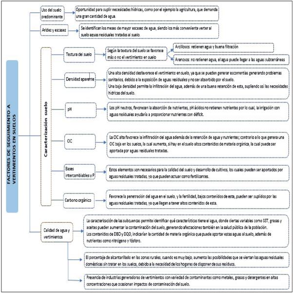 Todos estos datos se superponen para relacionar los factores que se deben tener en cuenta con el fin de evitar impactos al suelo y a la salud humana. De esta forma se facilitará la elección de los sitios de disposición de aguas residuales en suelos, con el fin de lograr beneficios y reducir los riesgos. La figura 6 presenta los factores de seguimiento a vertimientos en suelo con la información seleccionada.