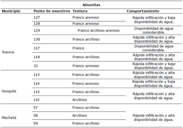 Adicionalmente, la información de CAR Cundinamarca (ver tabla 1) presenta las texturas. Según esos datos, el 28.6 % de los municipios de Almeidas tiene rápida infiltración y baja disponibilidad de agua; el 57.2 % tiene rápida infiltración y alta retención de agua; y el 14.3 % cuenta con una retención de agua considerable, debido a la presencia de texturas limosas.