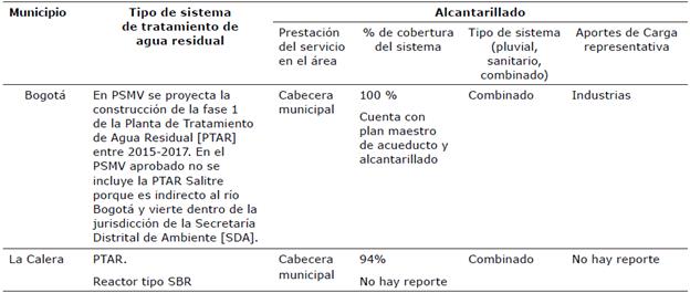 Como complemento relevante, hay que decir que se recopiló la información de cada uno de los municipios respecto a las características de los sistemas de alcantarillado disponibles en cada uno de ellos y la presencia o no de sistemas de tratamiento de agua residual; esto permite un reconocimiento de las dinámicas de manejo de las aguas en cada municipio, dado que estas características se pueden asociar a posibles temas de salubridad.