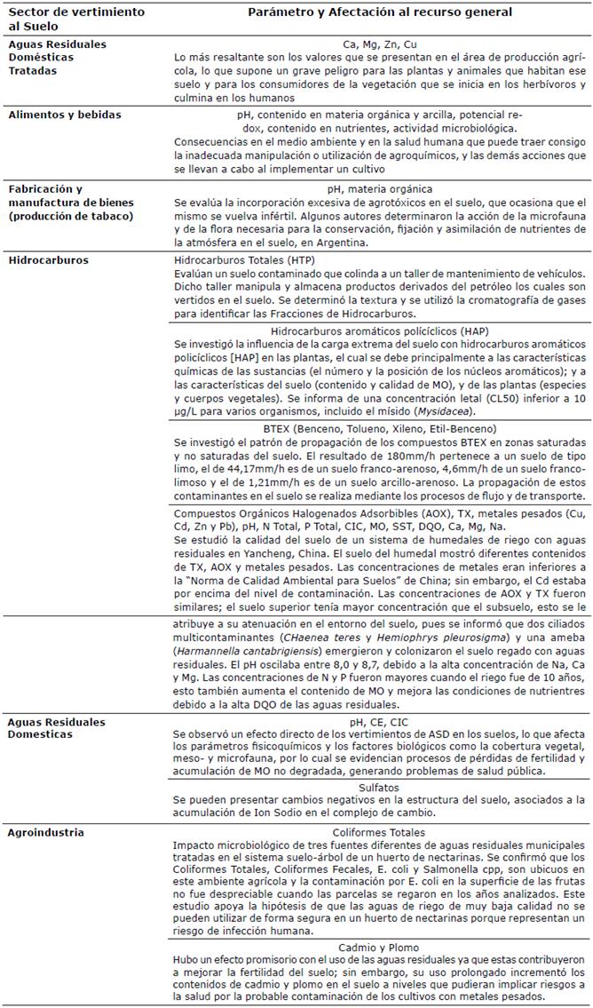 Como punto final, con la información obtenida se determinó la afectación a la biota del suelo por los parámetros de vertimientos en bases de datos. En ese rastreo se encontraron más de cincuenta artículos asociados a micro, meso, macro y mega biota afectada, lo que implica que hay una afectación debida a esta actividad. En la tabla 7 se aprecian algunos de los estudios encontrados sobre dicho efecto, todos ellos indican alteraciones negativas sobre la salud del recurso natural en especial sobre la biota del suelo (Vácha et al., 2010; Cui et al., 2016; Gaetano et al., 2013), algunos de ellos causan problemas de salud pública, ya que en humanos originan dolores intestinales, diarrea, fiebre y escalofríos, entre otros (PSU, 2020).