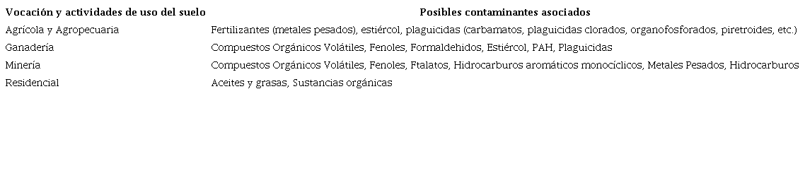 También se consultó la vocación de uso del suelo. Para ello fueron usados los datos reportados en las fichas de información de línea base para el proceso de concertación de metas de carga contaminante que dispone la CAR Cundinamarca, con el propósito de determinar la actividad a la que debería someterse el suelo y analizar si los posibles vertimientos en el mismo son aceptables. Ejemplo de ello se encuentra en la tabla 3.