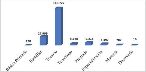 Una vez organizado el número de funcionarios por nivel académico, se evidencia que el 0,07 % tiene educación básica primaria, 16,62 % es bachiller, 71,51 % tiene una formación técnica, el 3,17 % es tecnólogo, un 5,53 % tiene pregrado, el 2,67 % ostenta especialización, un 0,42 % maestría y el 0,01 % doctorado. Es importante aclarar que existen funcionarios que tienen entre 1 y 4 carreras técnicas, tecnológicas y profesionales.