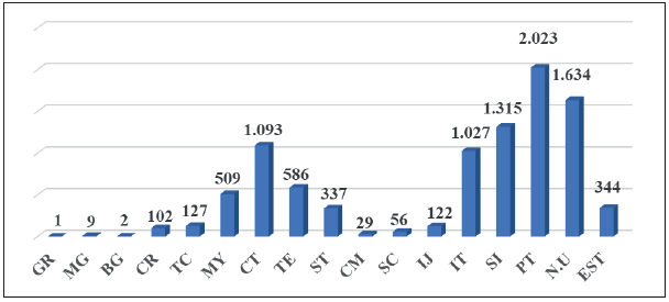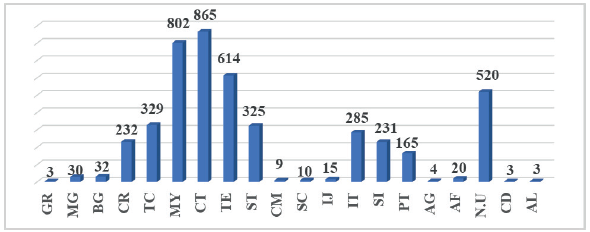 Siguiendo con la descripción del nivel académico, en la Figura 3 se muestra la cantidad de posgrado en especialización, del cual 4497 funcionarios reportan tener entre una y tres respectivamente. En total existen 7148 registros de especializaciones.