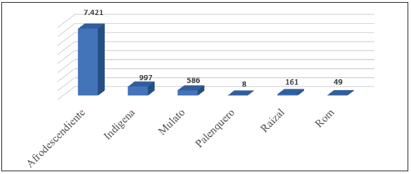 Según los datos expuestos en la anterior figura, se evidencia que el mayor porcentaje de policías se identifican a sí mismos como mestizos 94,56 %, seguido de afrodescendientes 4,38 %, indígenas 0,59 %, mulatos 0,35 % y palen-queros, raizales y rom el 0,13 %.