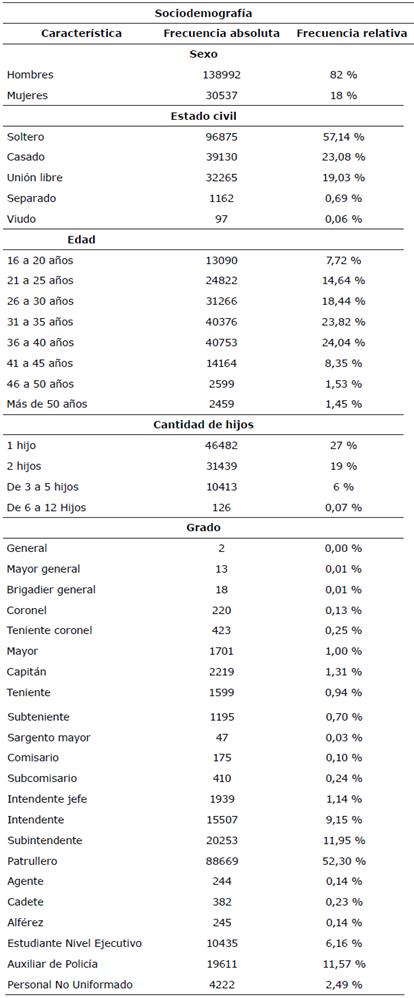 Teniendo en cuenta lo anterior, en la Tabla 1 se presentan las características sociodemográficas de la población objeto de estudio, correspondiente a 169529 funcionarios.