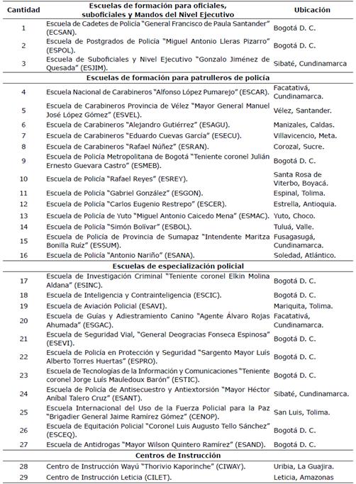 La oferta académica se operacionaliza a través de las diferentes escuelas de policía del país, logrando realizar la capacitación y cobertura en todo el territorio nacional de las unidades de policía en sus diferentes ámbitos de gestión (operativo, administrativo y docente).