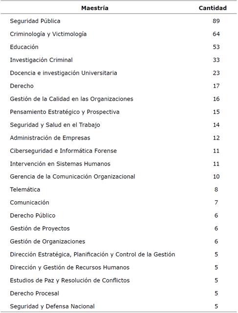 A continuación, se presenta una lista de las maestrías que más estudian los funcionarios de la Policía Nacional.