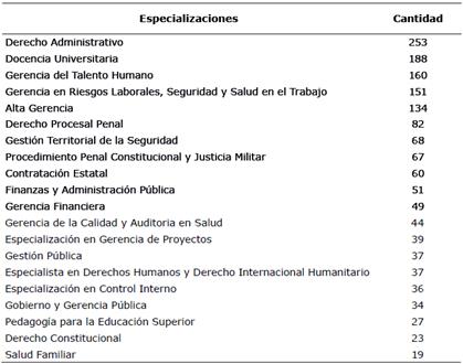 A continuación, se presentan las especializaciones que más estudian los policías.
