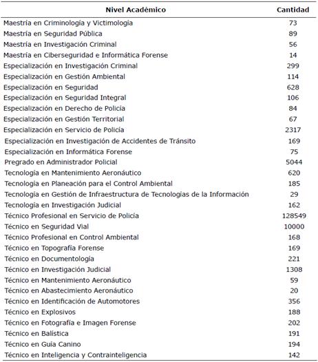 De acuerdo con el total de personal con profesiones liberales (9.316), el personal del nivel ejecutivo cuenta con el 49 % de las profesiones, seguido de los oficiales con un 30 %; los no uniformados con el 17 % y los estudiantes (alférez, cadete y estudiantes del nivel ejecutivo) con un 4 % respectivamente.