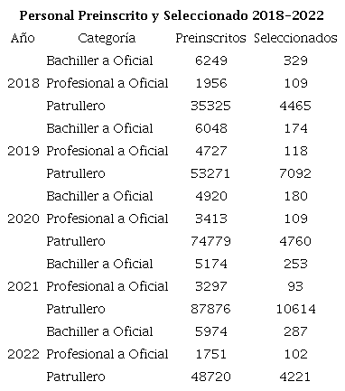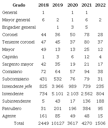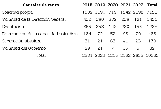 Desde el 1 de enero de 2018 al 16 de mayo de 2022, 21.969 policías han recibido la asignación de retiro; de este personal 649 (3 %) pertenecen a la categoría Oficial, 134 (1 %) Suboficiales, 20.828 (95 %) integrantes del Nivel Ejecutivo y 358 (2 %) Agentes. Al verificar la variable tiempo de servicio se evidencia que el 93 % del personal retirado realizó la solicitud con un tiempo laborado entre 20 y 25 años; un 5 % entre los 26 y 30 años; y por último el 1 % que contaba con más de 31 años.