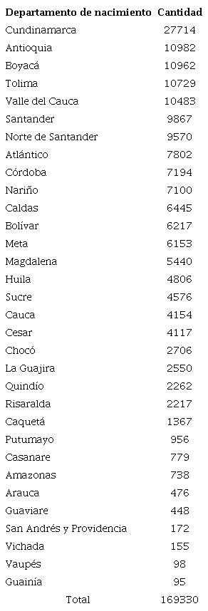 De los 169330 funcionarios nacidos en Colombia, el 16 % son del Departamento de Cundinamarca, aquí se incluyen los oriundos de Bogotá; los departamentos de Antioquia, Boyacá, Tolima, Valle del Cauca, Santander y Norte de Santander tienen una representatividad del 6 %; Atlántico 5 %; Córdoba, Nariño, Caldas, Bolívar y Meta un 4 %; Magdalena, Huila y Sucre un 3 %; Cauca, Cesar, Chocó y Guajira el 2%; Quindío, Risaralda, Caquetá y Putumayo un 1 %.