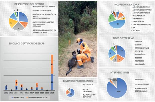 Según los consolidados de emergencias compilados por UNGRD, desde 2012 hasta 2022 se tiene registro de 5141 emergencias en las que podría contribuir un K9SAR. El 16 % están relacionadas con colapso estructural y el 84 % con fenómenos de remoción en masa o con sus causas asociadas. Debido a que no todos los eventos implican víctimas, 291 eventos de los fenómenos de remoción en masa involucran mayormente fallecidos y 203 eventos de los colapsos estructurales involucran principalmente personas heridas; se busca que los desaparecidos al cierre de la emergencia sean hallados vivos o muertos (UNGRD, 2021). Es importante comprenderlo para enviar los equipos K9SAR de acuerdo con la cinemática de la emergencia y con los tiempos transcurridos desde el momento inicial.