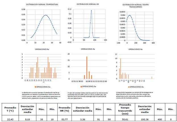 El número de intervenciones por año con los binomios está relacionado con decisiones en su mayoría administrativas, logísticas y del tiempo operacional; el promedio es de tres. Del comportamiento de las variables Temperatura y Humedad relativa se puede observar que la distribución normal se asemeja a la distribución real de las operaciones (ver Figura 2). La preparación integral, la experiencia de hombre y perro, es importante para hallar humanos vivos o muertos; por otro lado, el tiempo de avance después de ocurrido el desastre o el evento también es fundamental para lograr resultados favorables. Además, se evidencia que una humedad relativa media y temperaturas de entre 15 y 20 °C, humedad del 80 % y tiempo de ingreso a la operación en las primeras horas, son las variables que más favorecen la conservación del olor. En cuanto al tiempo transcurrido desde la hora cero a la intervención, se evidencia que es mayor la posibilidad de éxito en la medida en que se llegue más pronto a la zona. Asimismo, de los treinta eventos registrados se describen doce marcaciones efectivas, nueve descartes de zona, una falsa marcación y no se cuenta con información en un evento. En los alistamientos que no concluyeron en una operación no se aplican hallazgos.