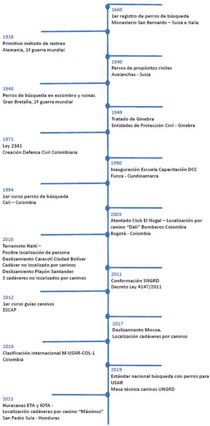 Para el 2018 se presentó a clasificación internacional ante la Organización de Naciones Unidas [ONU] el equipo mediano de rescate urbano (Medium Urban Search and Rescue) M-USAR-COL-1 (UNGRD, 2016) con su correspondiente componente de búsqueda con caninos, conformado por todos los organismos adscritos al Sistema Nacional para la Gestión de Riesgos de Desastres [SNGRD]. Como resultado de ese proceso se recibieron las credenciales y el aval bajo lineamientos de las Guías INSARAG (INSARAG, marzo de 2018). Por otra parte, en 2019, se instauró la Mesa Técnica de Caninos de la UNGRD (Informe de gestión, 2019), con la participación de representantes de todos los organismos adscritos a la Unidad. El propósito era estandarizar los contenidos de los procesos de formación y entrenamiento de guías caninos de las diferentes escuelas autorizadas por el Ministerio de Educación Nacional, y los criterios de certificación nacional para la especialidad de búsqueda y localización de personas vivas en estructuras colapsadas, dirigido a los equipos USAR, bajo normativas del Grupo Asesor Internacional de Operaciones de Búsqueda y Rescate (INSARAG - Search and Rescue Advisory Group). En Colombia, la mayoría de los binomios que respondieron ante la atención de desastres eran empíricos, lo que demostró la necesidad de mejorar los procesos institucionales (Cuerpo Oficial Bomberos Bogotá, 2021) (ver Figura 3).