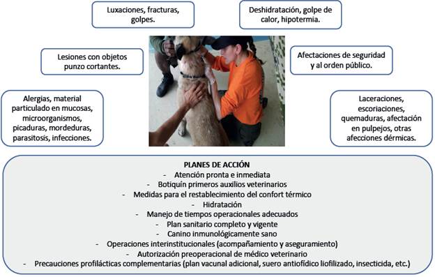 En la atención de una emergencia, tanto el guía como el canino pueden enfrentarse a situaciones que pueden alterar su salud física y/o mental (Gordon, 2012; Gordon, 2015); sin embargo, los caninos solo ingresan cuando la zona está asegurada, libre de atmósferas contaminadas y/o materiales peligrosos o estructuras inestables (INSARAG, 2020). Además, el proceso de formación y entrenamiento está encaminado al fortalecimiento en todas las áreas, así como al establecimiento de medidas para minimizar el impacto (ver Figura 4).