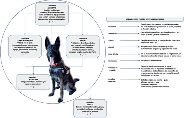 Los conceptos descritos anteriormente, son complementarios entre sí y están intrínsecamente relacionados cuando se estudia la conducta animal (Veissier y Boissy, 2007; Gutiérrez et al., 2007; Mellor, 2012). Por lo anterior, en esta investigación y desde el punto de vista humano-animal-ambiente (One Welfare), se puede afirmar que la percepción de las circunstancias externas puede alterar el estado funcional interno del animal cuando participa en operaciones K9SAR, este fenómeno es reconocido como un resultado subjetivo o emocional ligado comportamentalmente al bienestar (Mellor, 2015).