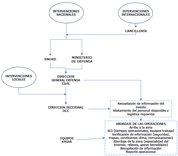 Por otra parte, con el propósito de atender ágilmente los diferentes tipos de desastres, el Gobierno nacional instauró normas para contrarrestar las emergencias en casos de grave calamidad pública, perturbación del orden público y "estados de sitio", establecidos en el artículo 215 de la Constitución Política de Colombia (CPC, 1991). Se pretende así atender oportunamente los acontecimientos y seguir los protocolos establecidos en el Sistema Nacional para la Gestión del Riesgo de Desastres [SN-GRD], adscrito a la Unidad Nacional de Gestión de Riesgo [UNGRD] (Ley 1523, 2012) y donde participan los caninos de búsqueda y rescate de personas [K9SAR].