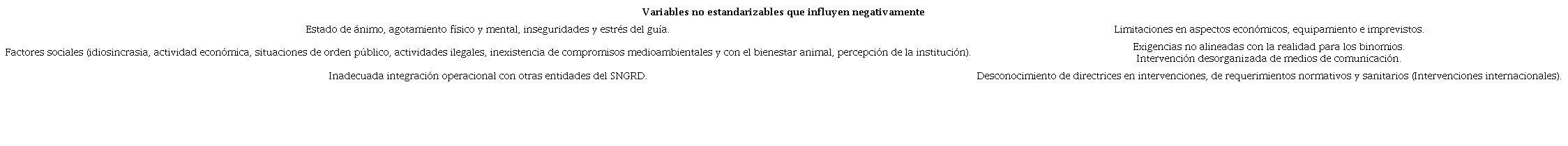 Dentro de las operaciones incluidas en el estudio, no se tiene referencia de afectación a la salud física del canino en ninguna de ellas; es predominante la inclusión de la logística y aceptación de la presencia y compromiso con el perro por parte de todo el equipo de trabajo. Esos son factores protectores del bienestar no solo del animal sino de los humanos (víctimas y rescatistas). El entorno es un factor de modificación del comportamiento, así como los elementos sociales inter e intra-específicos y de cooperación (López, 2021) Además de las variables ambientales, se pueden presentar otras (ver Tabla 1), para las cuales el binomio debe prepararse y fortalecer su resiliencia con el fin de no afectar la operatividad ni el bienestar de ambos.
